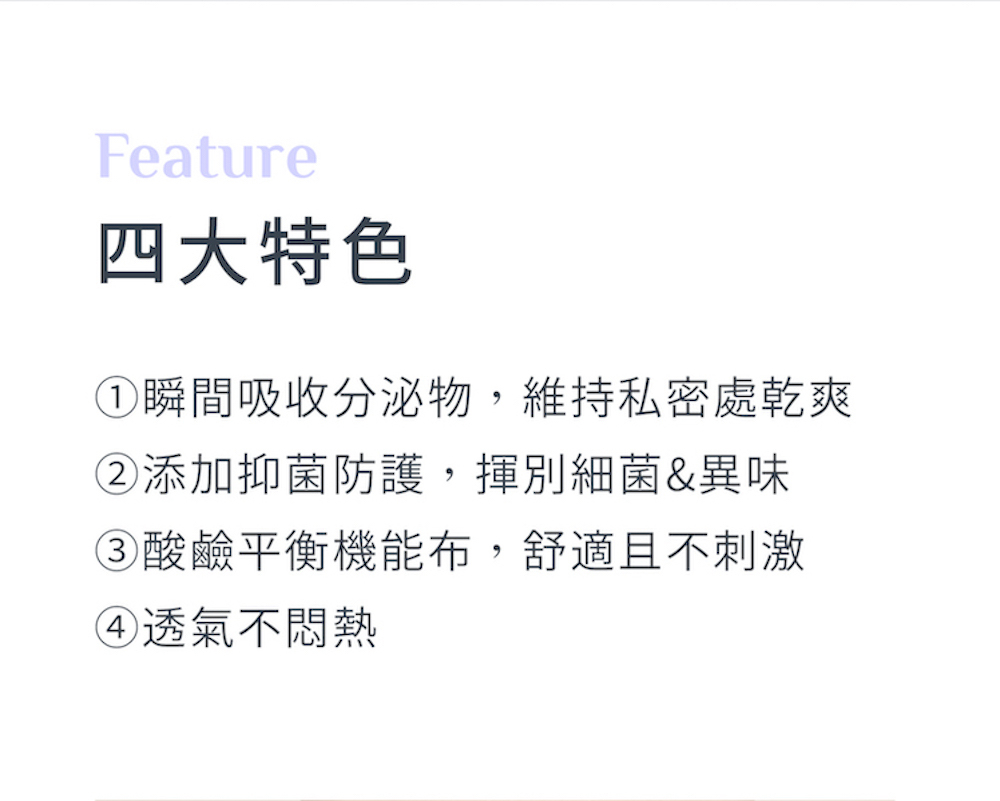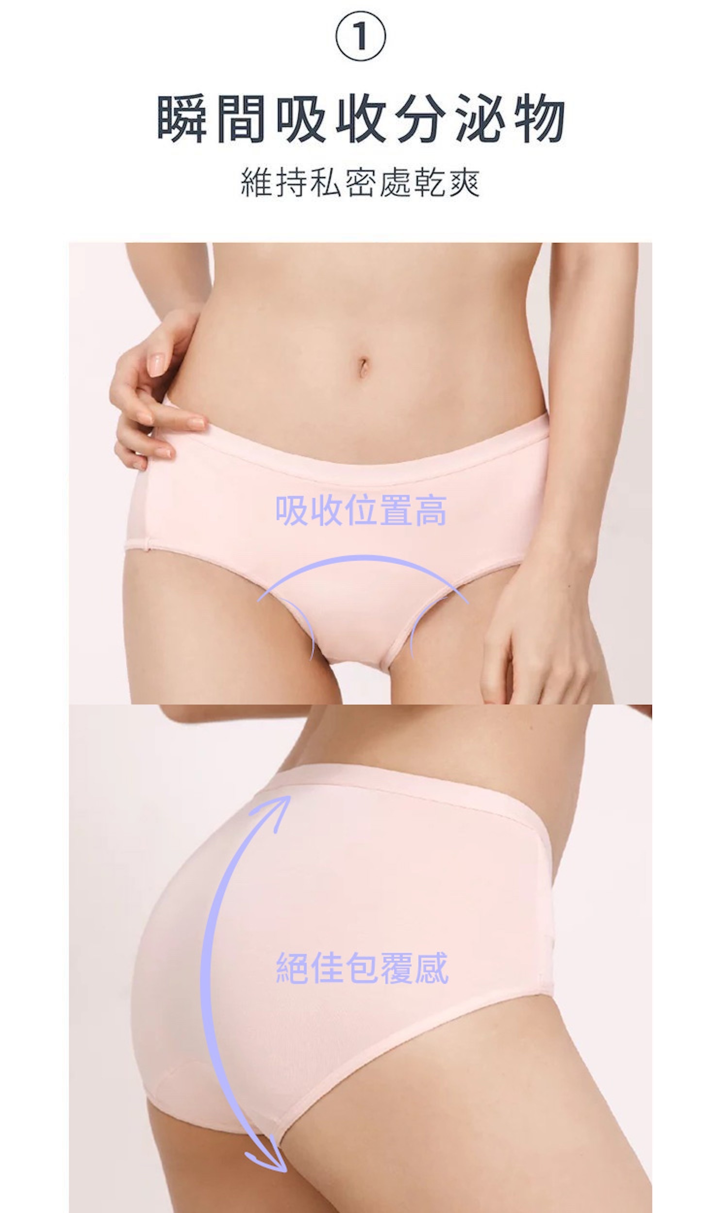 ①瞬間吸收分泌物,維持陰部乾爽,單穿就跟護墊說掰掰